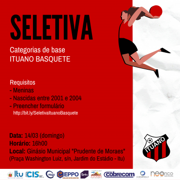 Para participar, além de corresponder aos requisitos acima (gênero e ano de nascimento), as interessadas deverão preencher, até às 15h30 do dia 12 de março, o formulário disponível no seguinte link: http://bit.ly/SeletivaItuanoBasquete. No dia da atividade, deverão apresentar RG e termo de responsabilidade e consentimento em razão da pandemia por Covid-19.